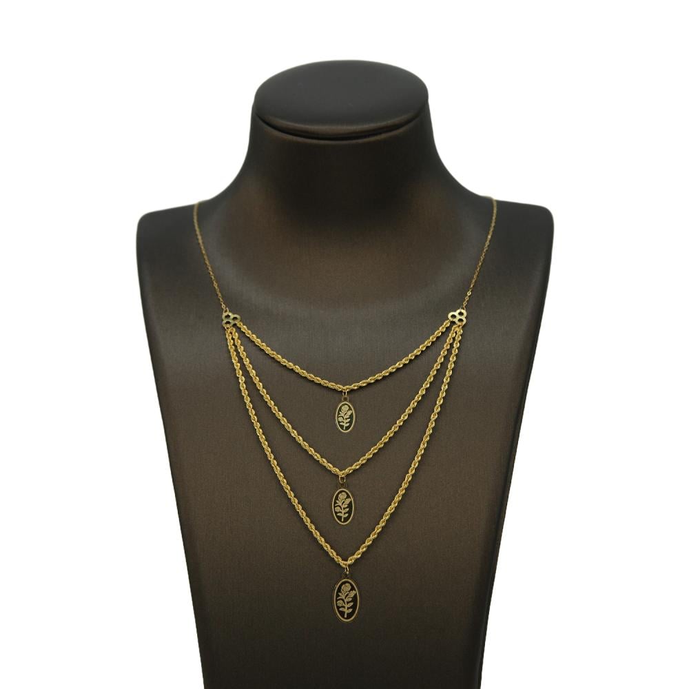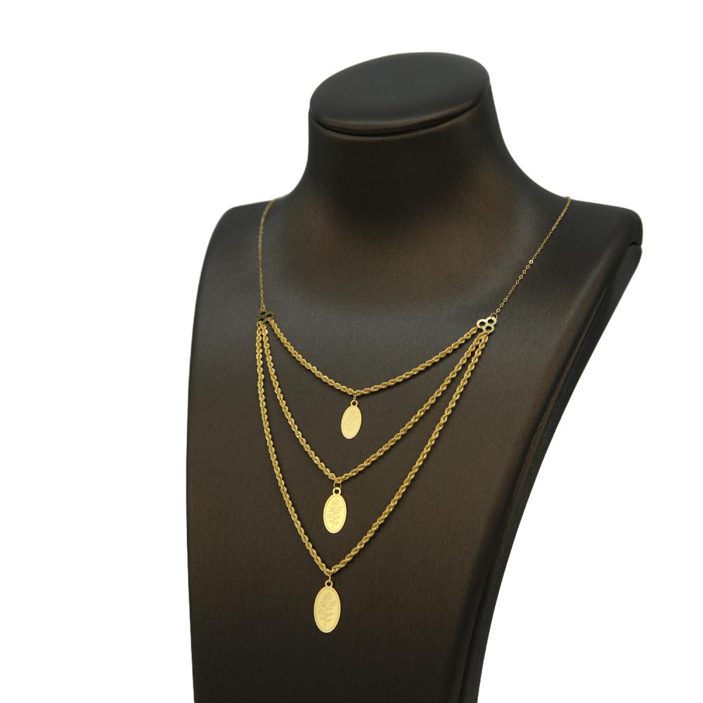 يأتي العقد بطول 40 سم، مصمم لينسدل بخفة حول الرقبة بثلاث سلاسل ذهبية ناعمة متدرجة الطول، تتدلّى منها ثلاث تعليقات بيضاوية تحمل نقوش أوراق نباتية محفورة بدقة.