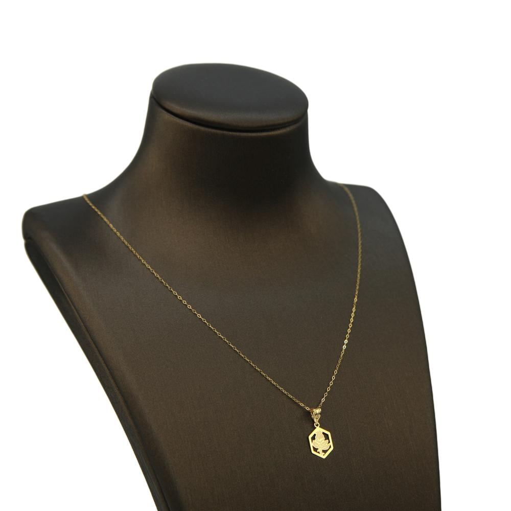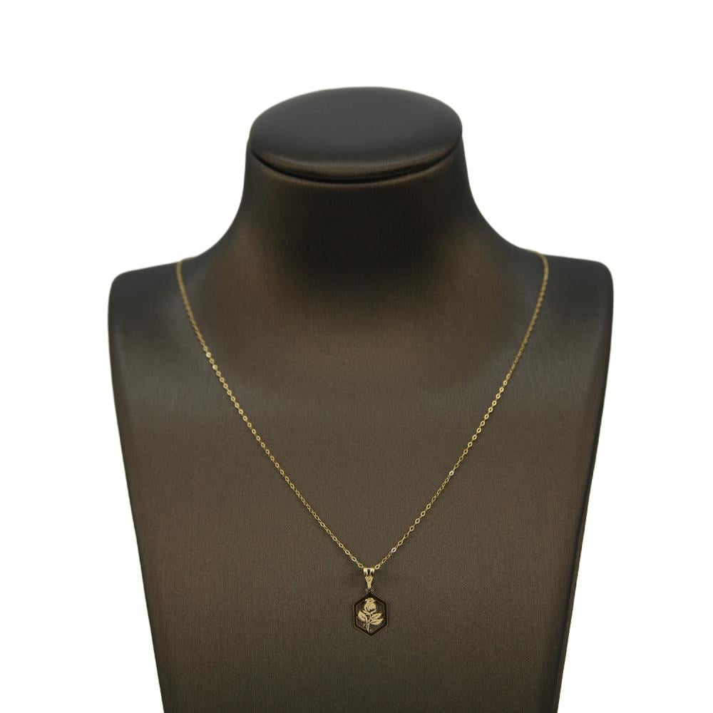 استمتعي بتفاصيل أنيقة مع تعليقة وردة سداسية المصنوعة من ذهب عيار 21، بتصميم فريد يجمع بين شكل الوردة الرقيقة والإطار السداسي العصري.