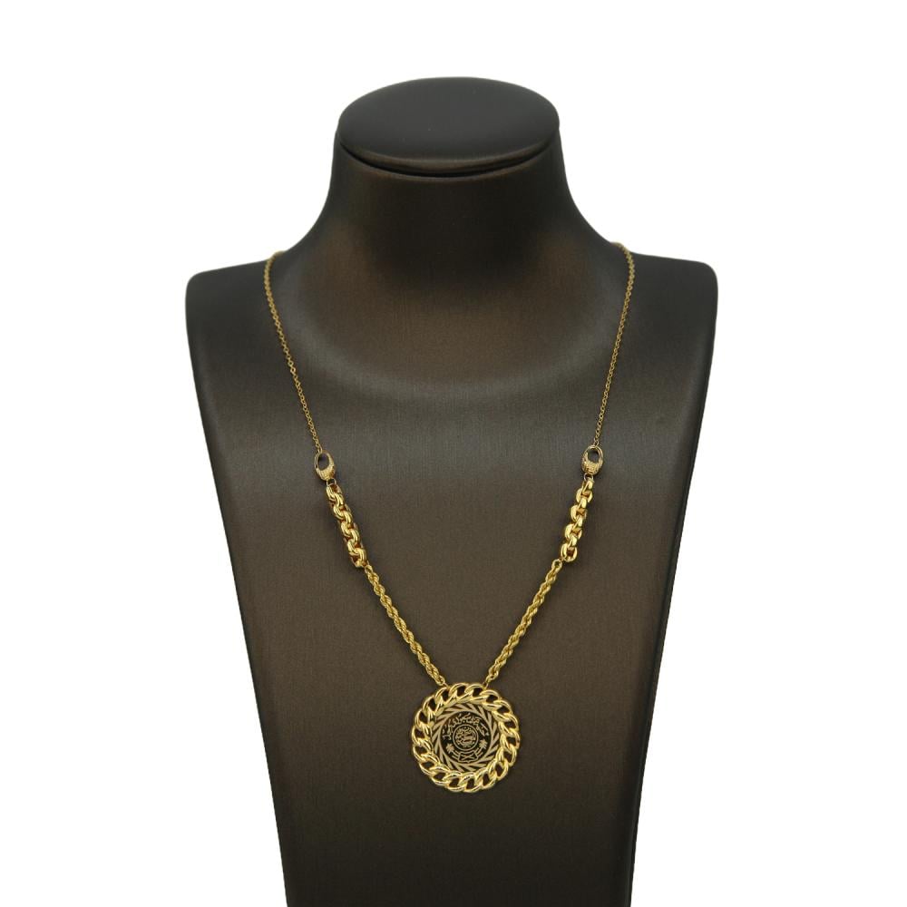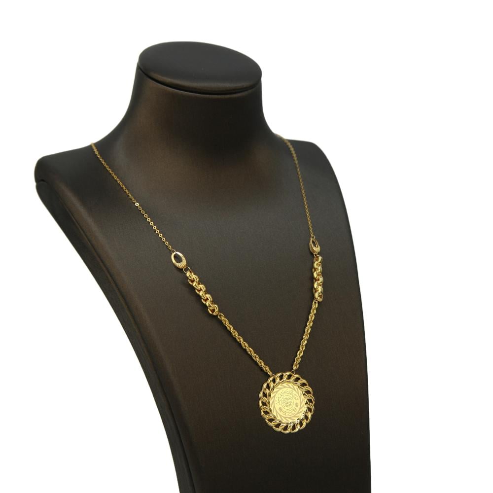 تألقي بتصميم يجمع بين الفخامة والهوية مع عقد التاج المنقوش المصنوع من ذهب عيار 21. تتوسطه تعليقة دائرية محاطة بإطار مجدول فاخر، تحمل نقش الجنيه العربي السعودي المحفور بدقة، في لمسة...