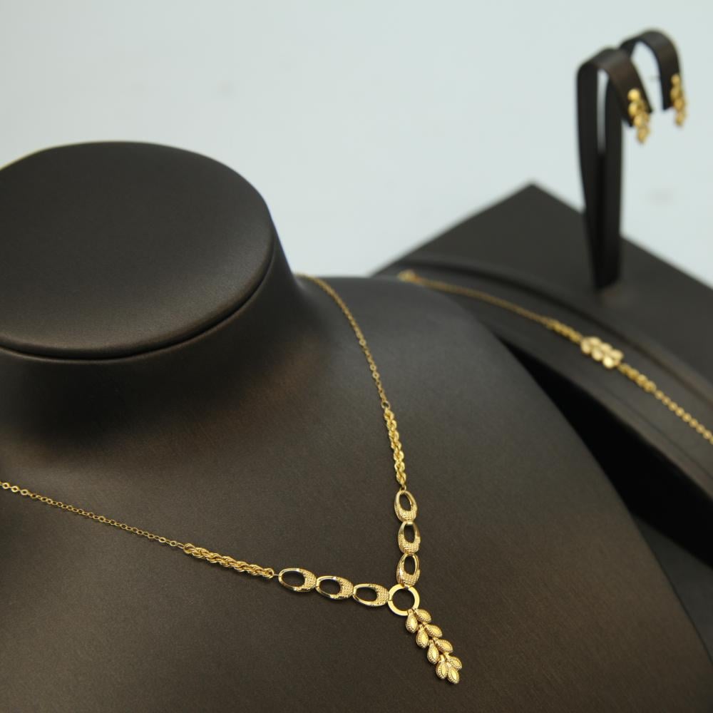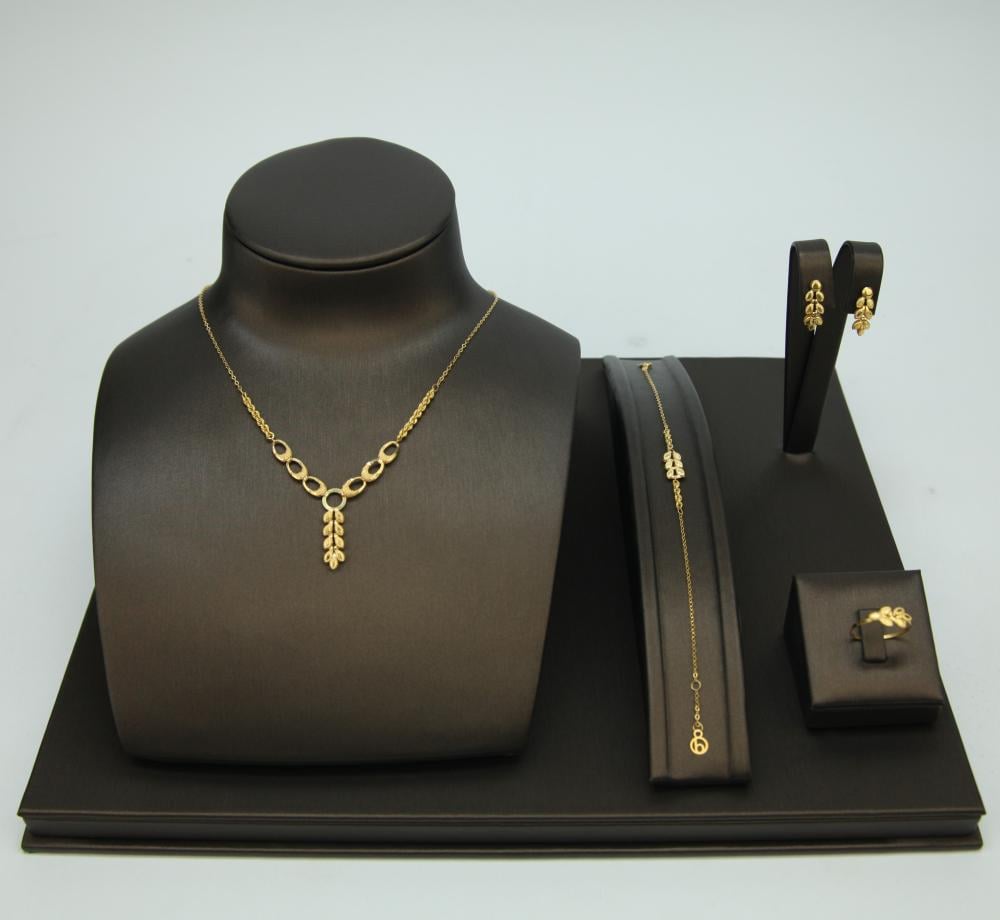يتكوّن من عقد بطول 40 سم، وسوار بطول 18 سم، مع حلق وخاتم بتصميم متناسق وخالٍ تمامًا من الأحجار، ليمنحك إطلالة متكاملة يومية أو مناسبات بسيطة.