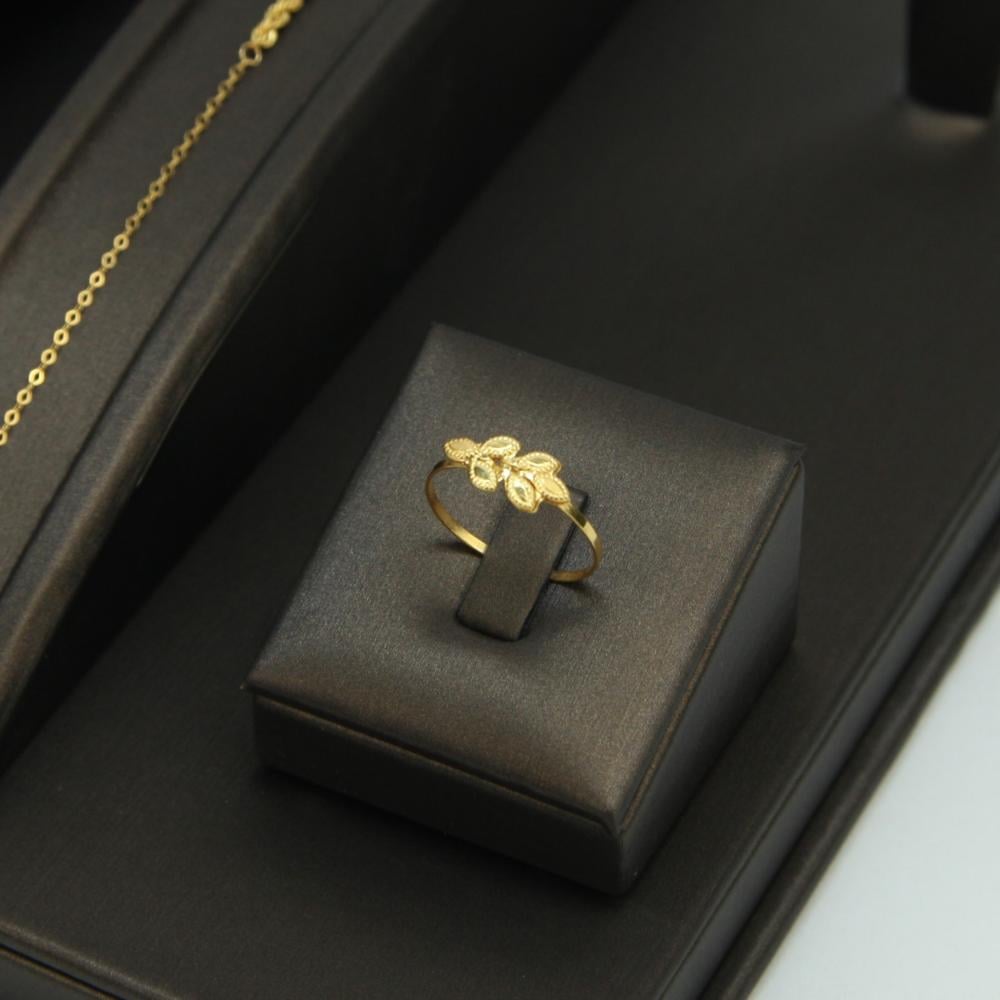 استمتعي بتصميم يجمع بين العصرية والطبيعة مع طقم "دوائر الزيتون"، المصنوع من ذهب عيار 21 بتفاصيل تتنوع بين الحلقات البيضاوية اللامعة وأوراق الزيتون المتدلّية.