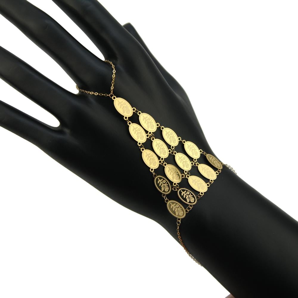 تألقي بجمال استثنائي مع كف "زخارف بيضاوية" المصنوع من ذهب عيار 21. يتميز بتصميم فريد يعتمد على وحدات بيضاوية منقوشة بزخارف أنيقة تتدرج بانسيابية لتزيّن اليد والمعصم برونق فاخر.