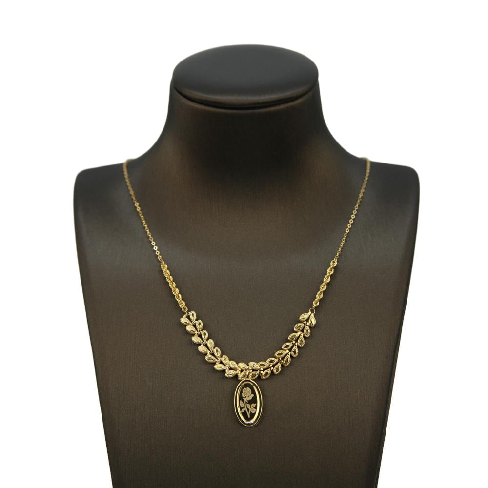 تتدلى من مركز العقد تعليقة بيضاوية بنقشة وردة محفورة بدقة على خلفية داكنة، ما يعزز التباين ويمنح القطعة حضورًا فريدًا.