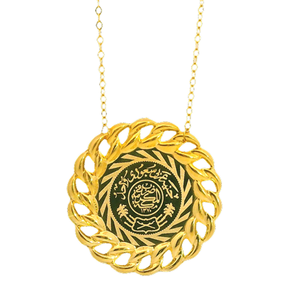 يتوسّط العقد جنيه ذهبي محفور بنقوش دقيقة مستوحاة من العملات التراثية، محاط بإطار ملتف يضفي عليه لمسة ملكية متقنة.