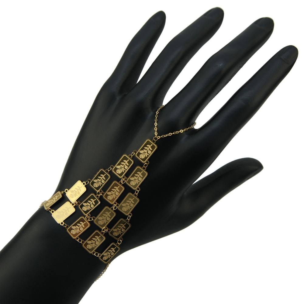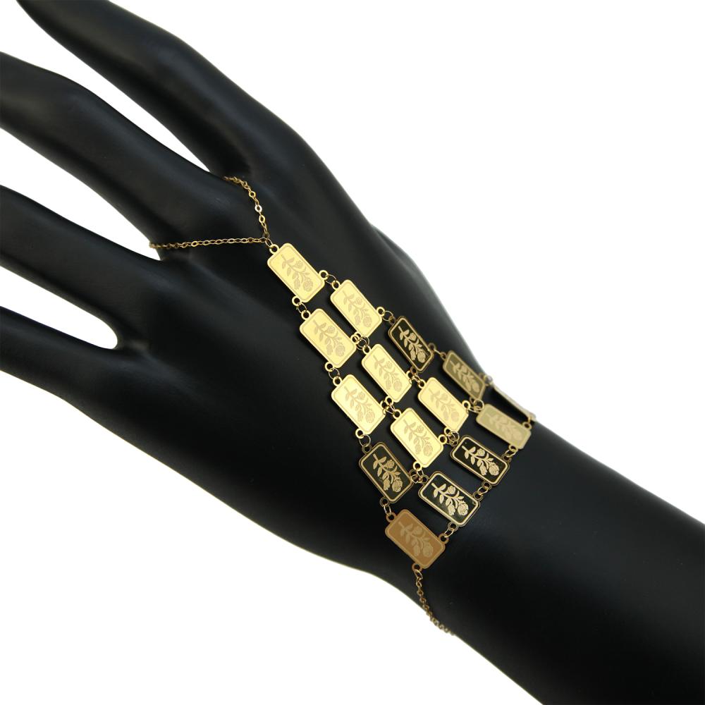 تميّزي بإطلالة فريدة مع كف "لمسة المستطيل" المصنوع من ذهب عيار 21، بتصميم متدرج من وحدات مستطيلة منقوشة بزخارف أنيقة تتصل بانسيابية لتزين اليد والمعصم بأسلوب فاخر.